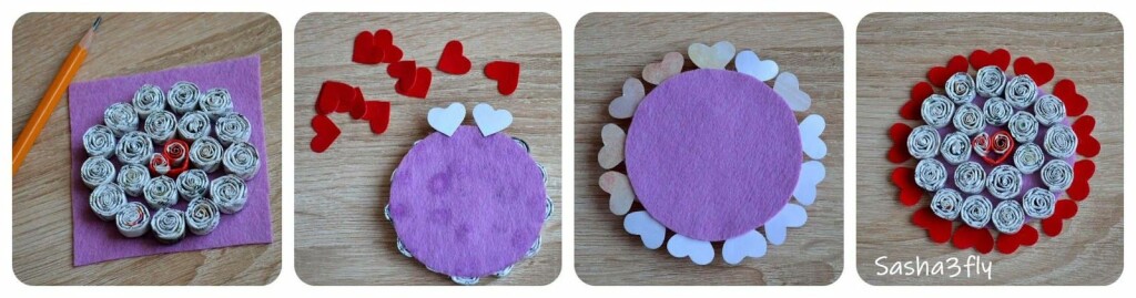Теперь нужно вырезать 2 кружочка из фетра. Помещаем на один из кругов все спирали и приклеиваем их. На обратной стороне клеим сердечки под каждой наружной спиралью. Затем приклеиваем второй кружок из фетра поверх сердечек.